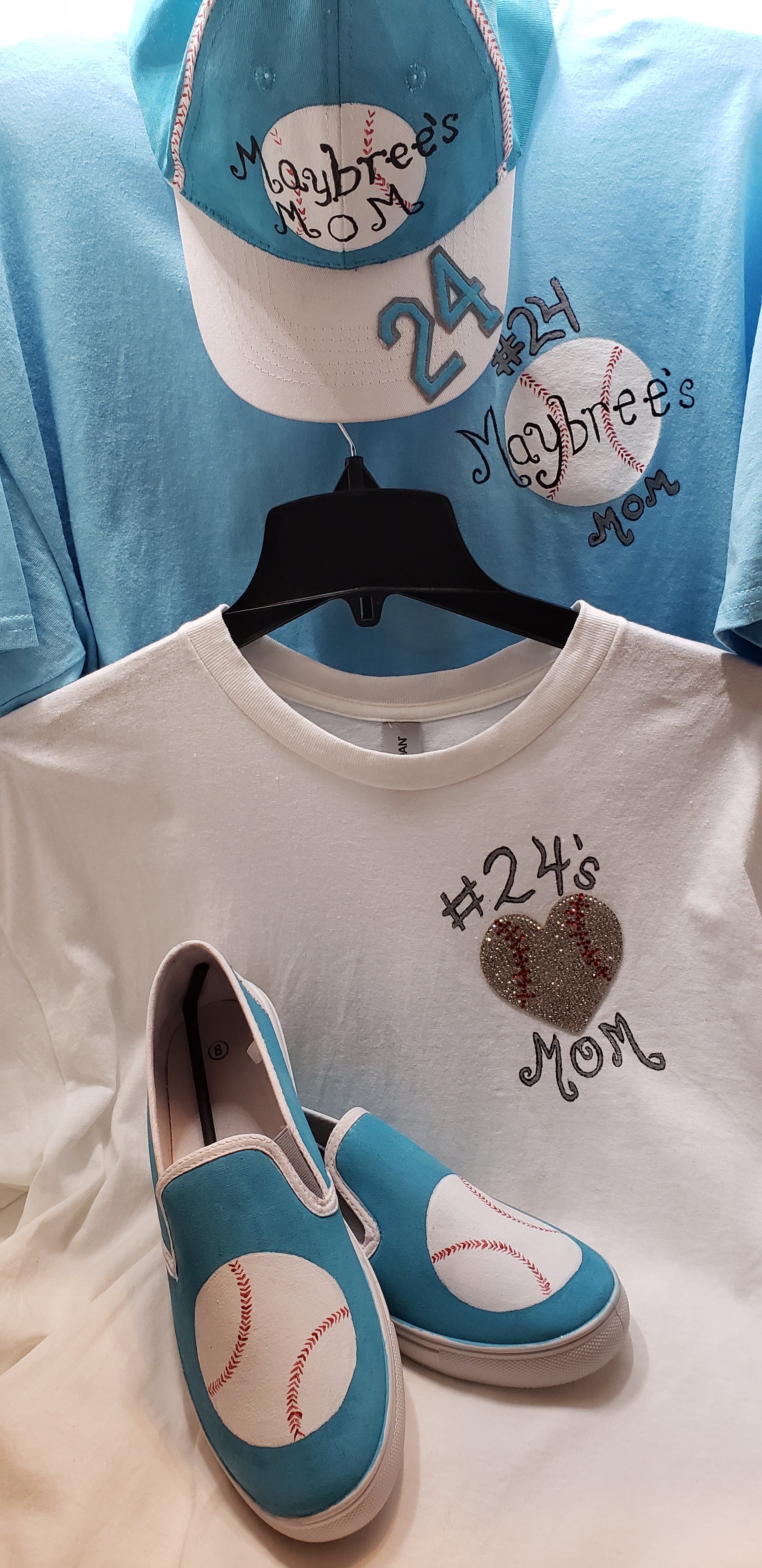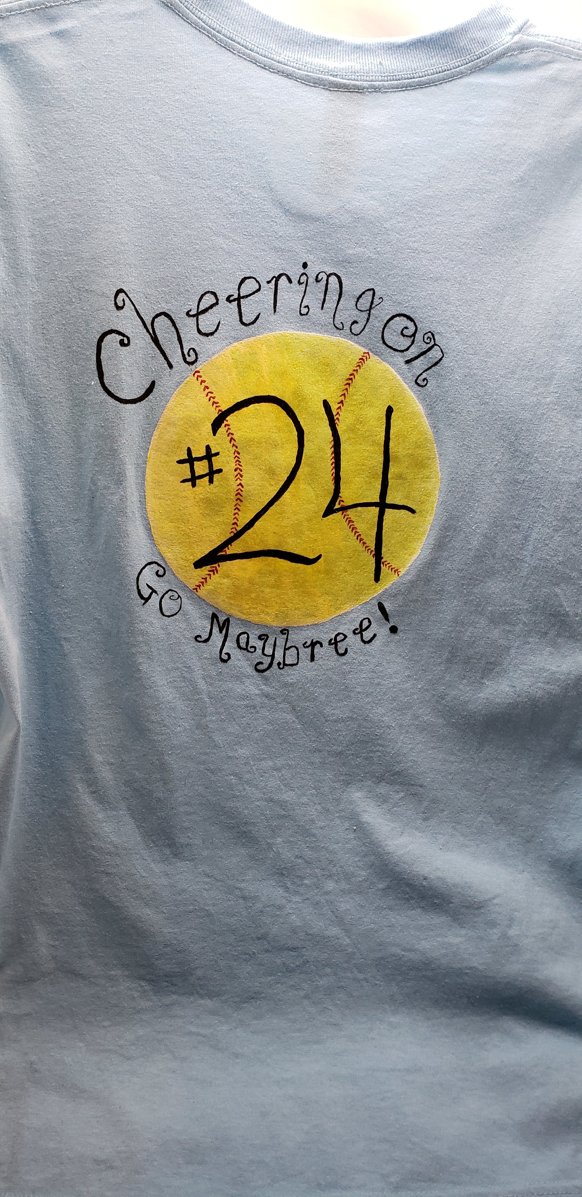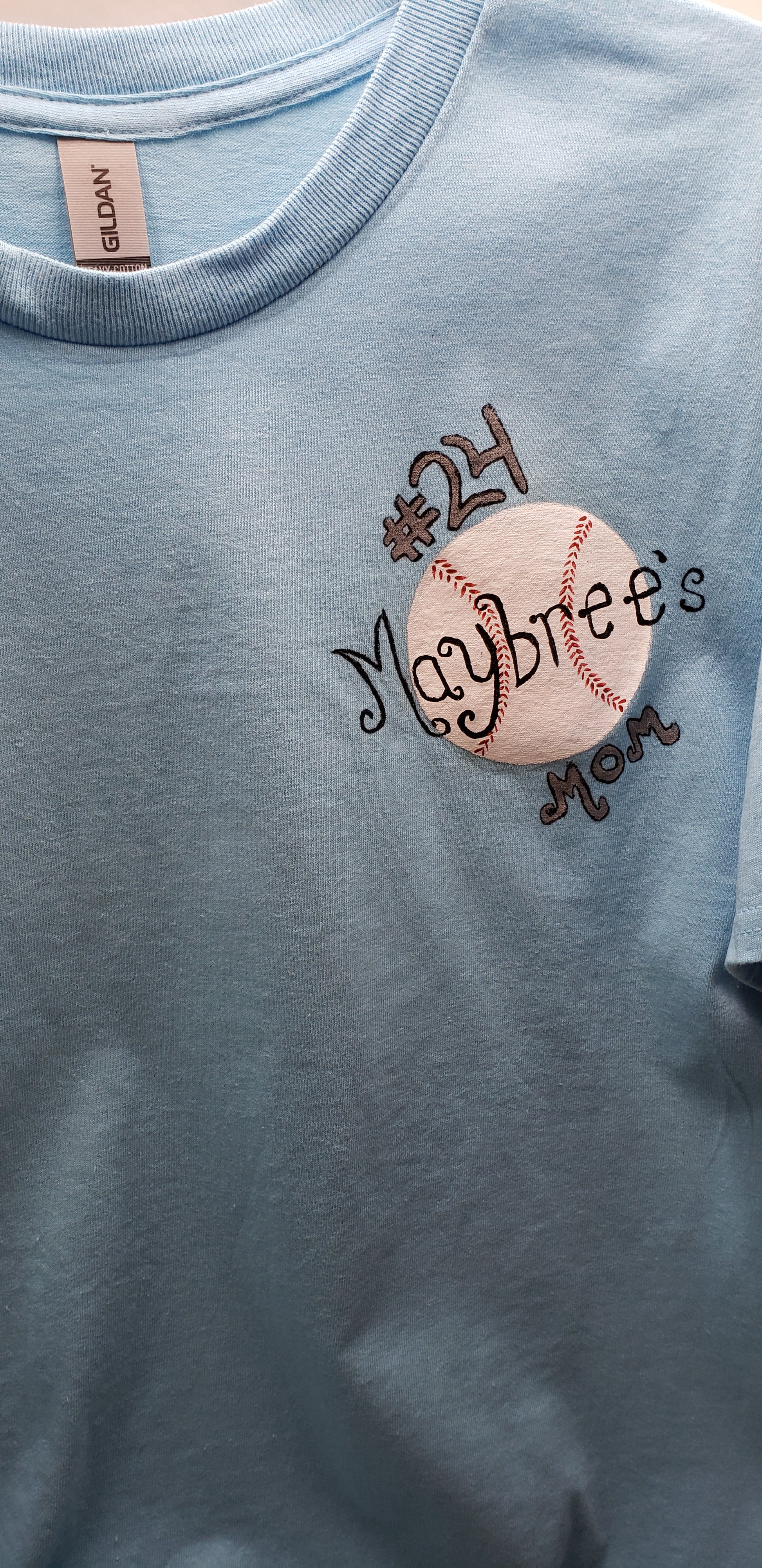 Color will be matched as closely as possible to information given. Front of shirt will have player number placed above sport ball. Chosen sport ball will have player name painted over it. Below the ball will be supporter's name or nickname such as Mom, Dad, Sister, etc. Back of shirt will have "Cheering On" above chosen sport ball and below with "Go -insert player name" The player's number will be painted on the ball.