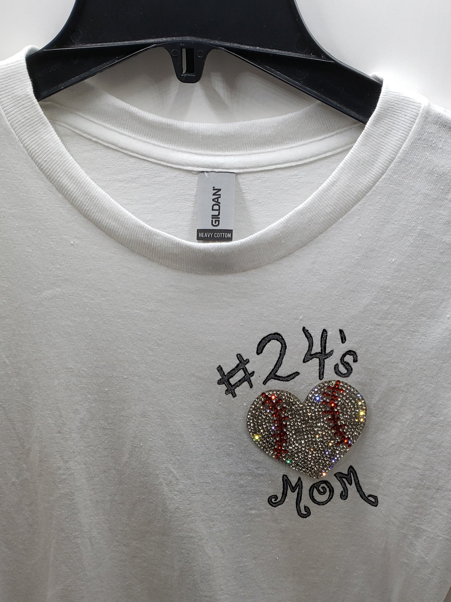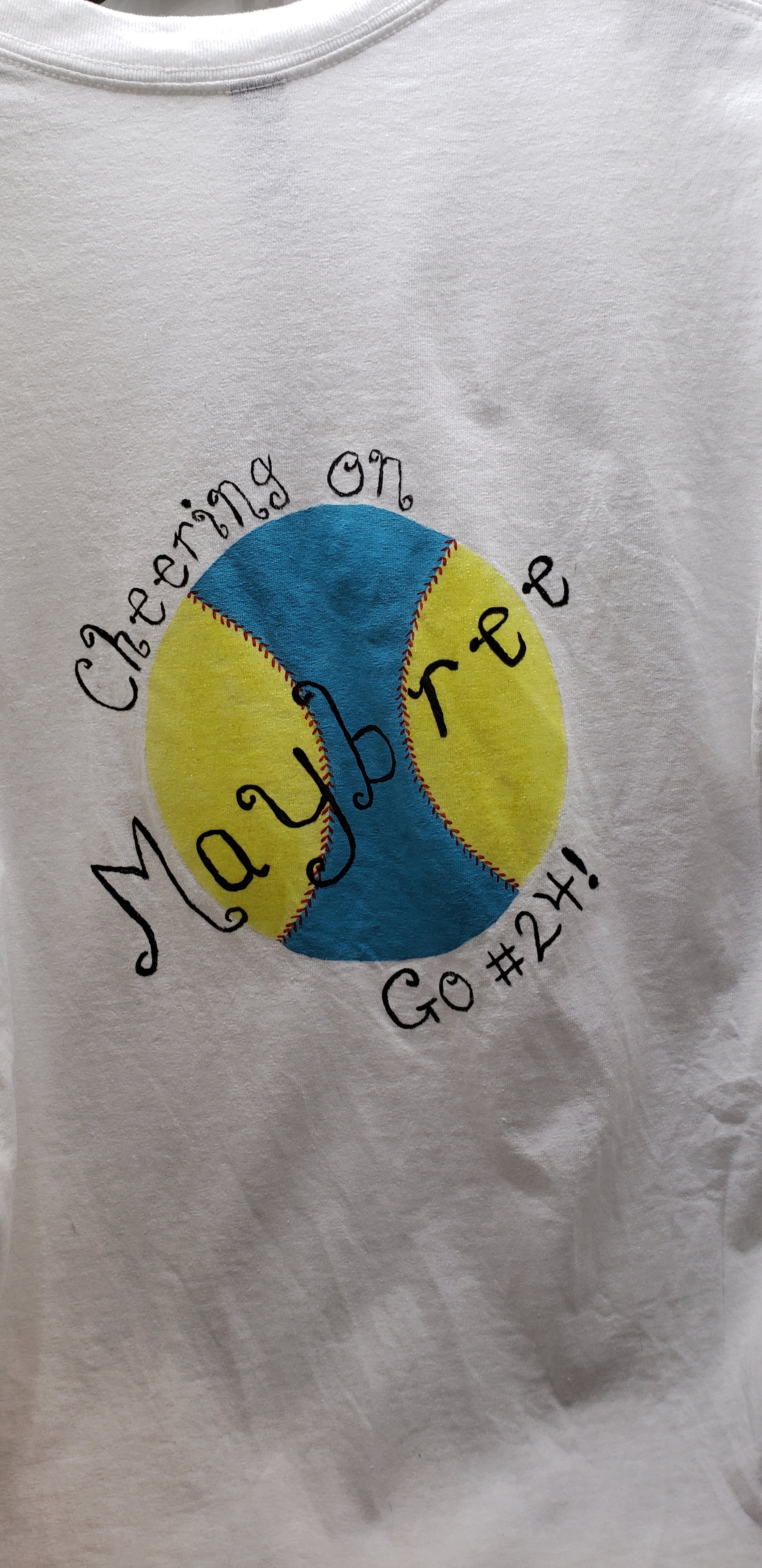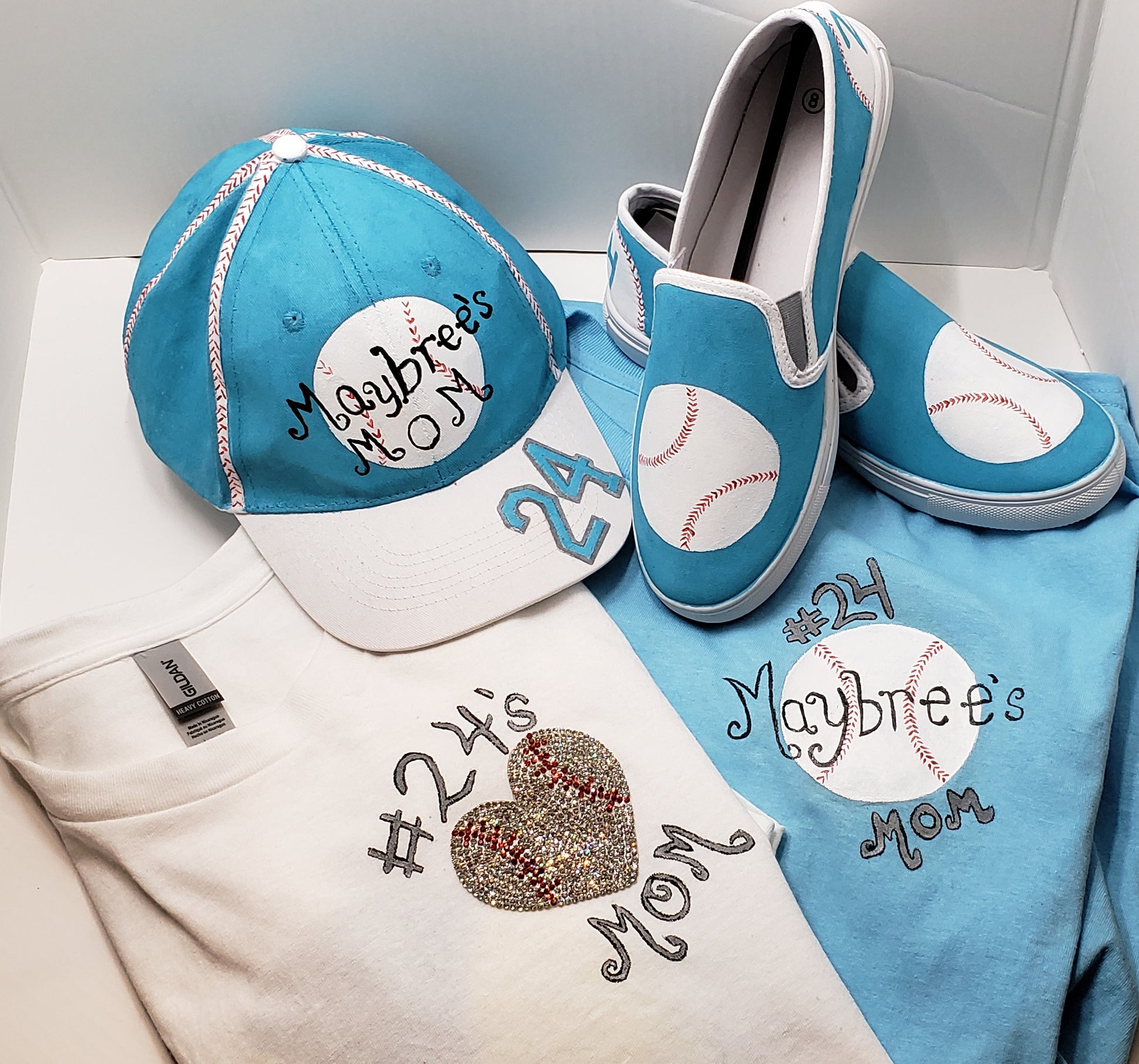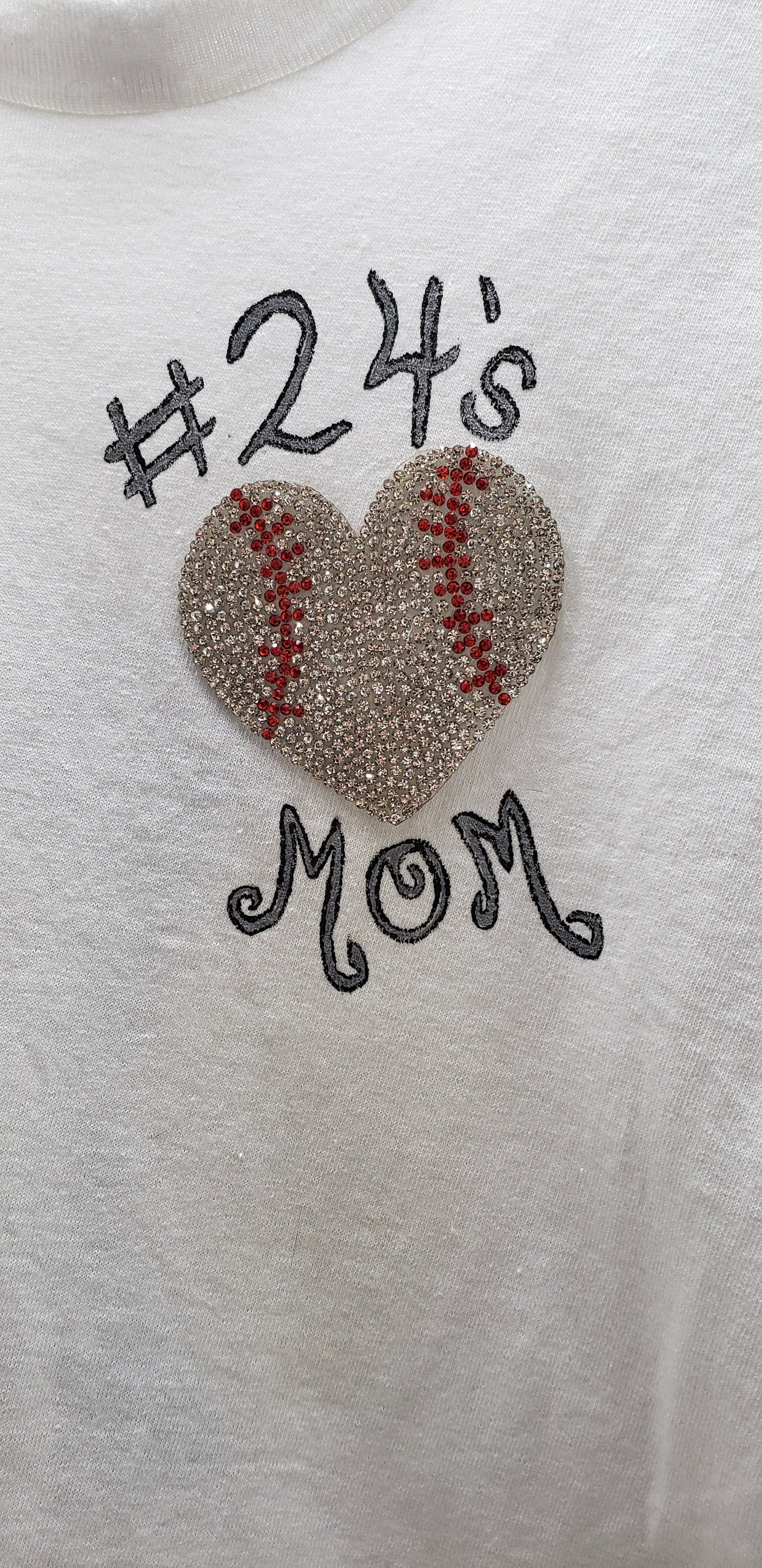 Color will be matched as closely as possible to information given. Front of shirt will have player number placed above sport ball or chose to have a heart version for a little bling (available as baseball, football or basketball). Chosen sport ball will have player name painted over it. Below the ball will be supporter's name or nickname such as Mom, Dad, Sister, etc. Back of shirt will have "Cheering On" above chosen sport ball and below with "Go -insert player number" The player's name will be painted on the ball. Ball will be done with either a mix of sport ball color and team color, team colors, or just sport ball: to be chosen below.