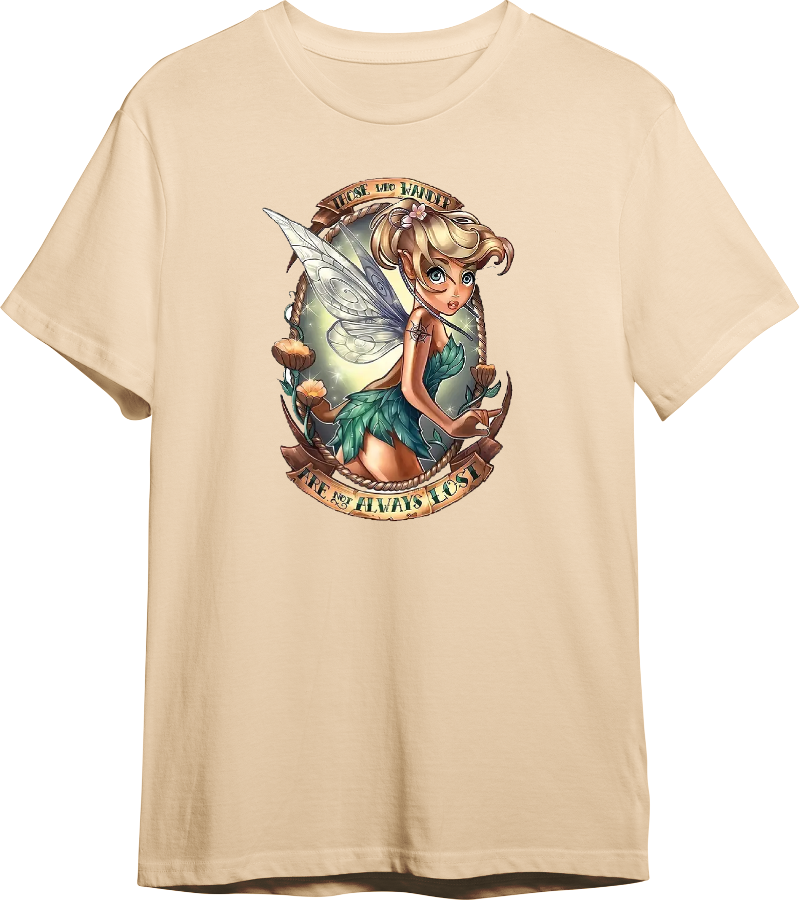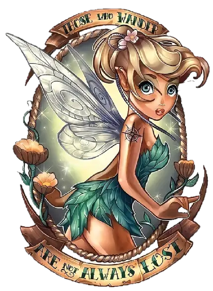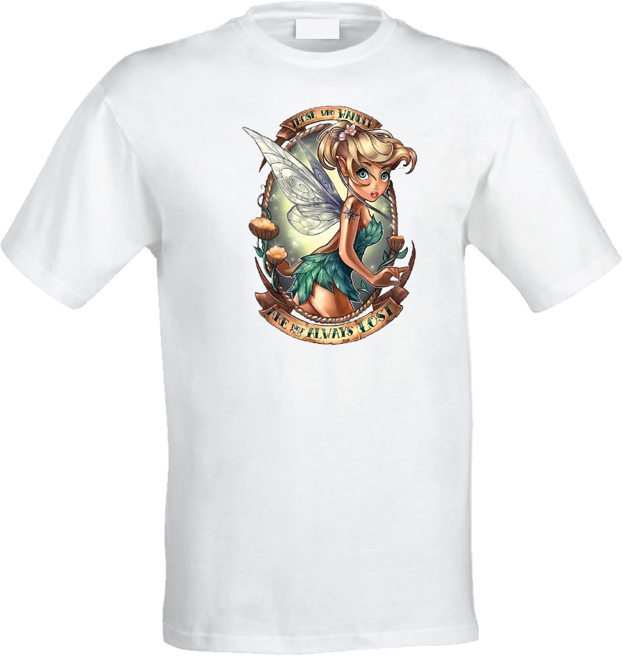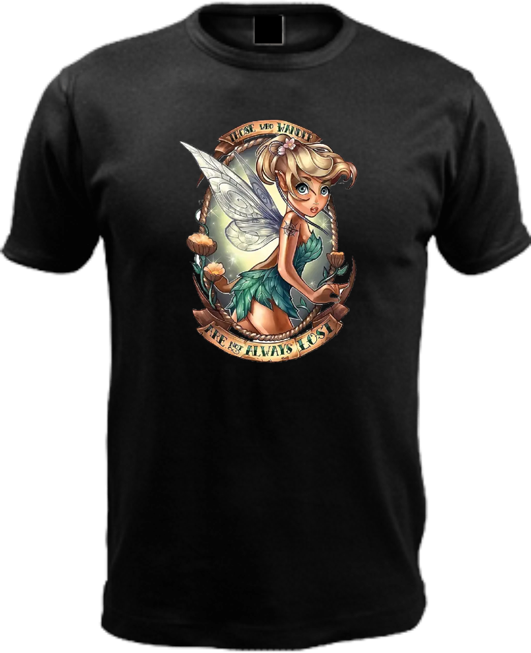 Tinkerbell reimagined! Classic crew neck t-shirt with your choice of tattoo princess. Look for our other designs! Tinkerbell: "Those who wander are not always lost". Made upon order.